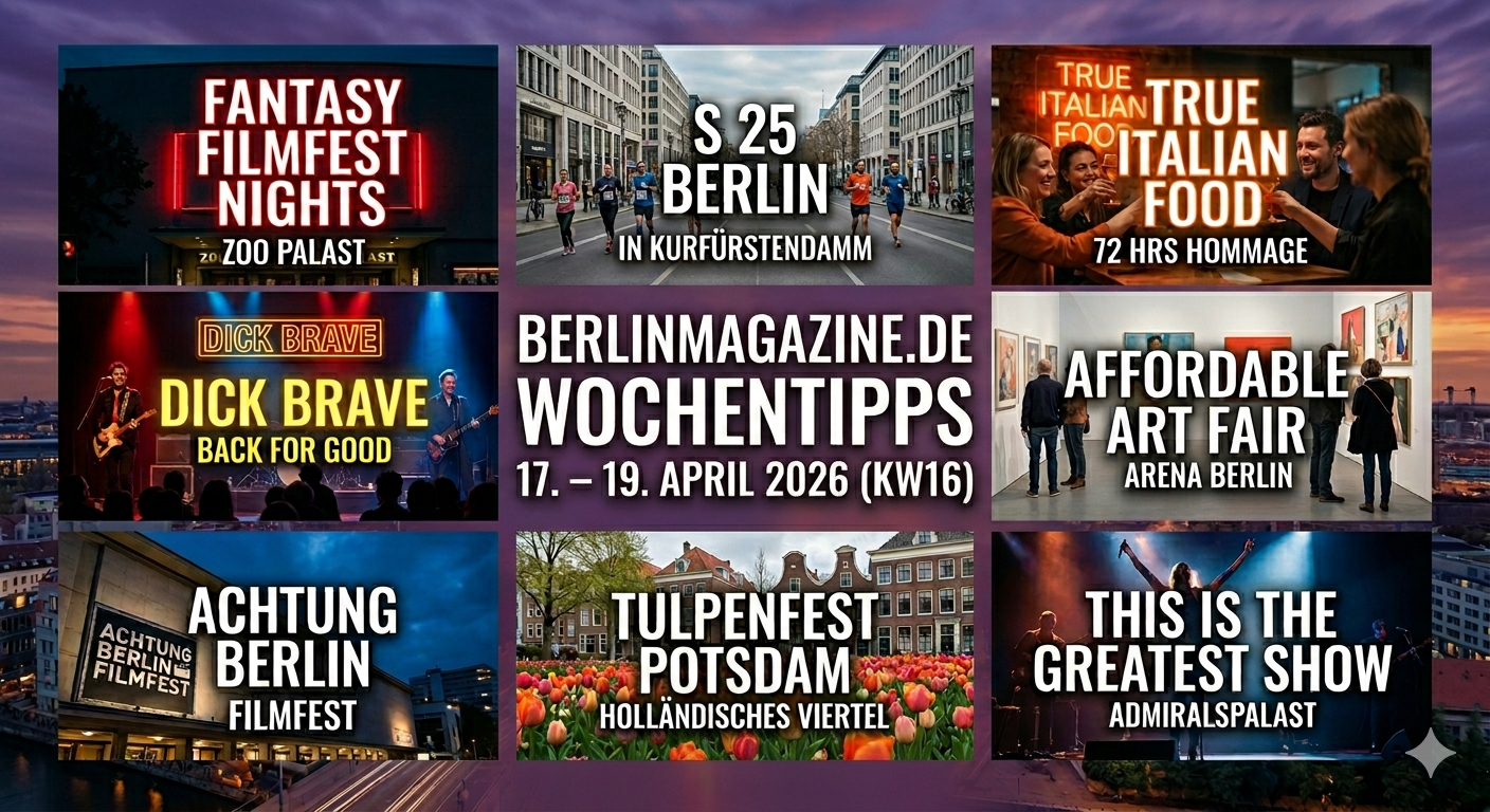 Tags: achtung berlin filmfestivalachtung berlin filmfestival 2026 ticketsAdmiralspalast Berlin ProgrammAdmiralspalast MusicalAffordable Art Fair BerlinAffordable Art Fair Berlin ArenaBerlin Event Guide KW16Dick Brave Berlin 2026Dick Brave Berlin KonzertFantasy Filmfest Nights 2026Fantasy Filmfest Nights ProgrammFlorian Schroeder BerlinFlorian Schroeder Berlin Tickets.Potsdamer Tulpenfest 2026 AnfahrtS 25 Berlin LaufS 25 Berlin StraßensperrungenTrue Italian Food Aperitivo BerlinTrue Italian Food BerlinTulpenfest Potsdam 2026Veranstaltungskalender Berlin AprilVeranstaltungskalender Berlin April 2026Wochenende Berlin 17.04.2026Wochenendtipps Berlin heuteWochentipps BerlinWochentipps Berlin KW16Zoo Palast Events