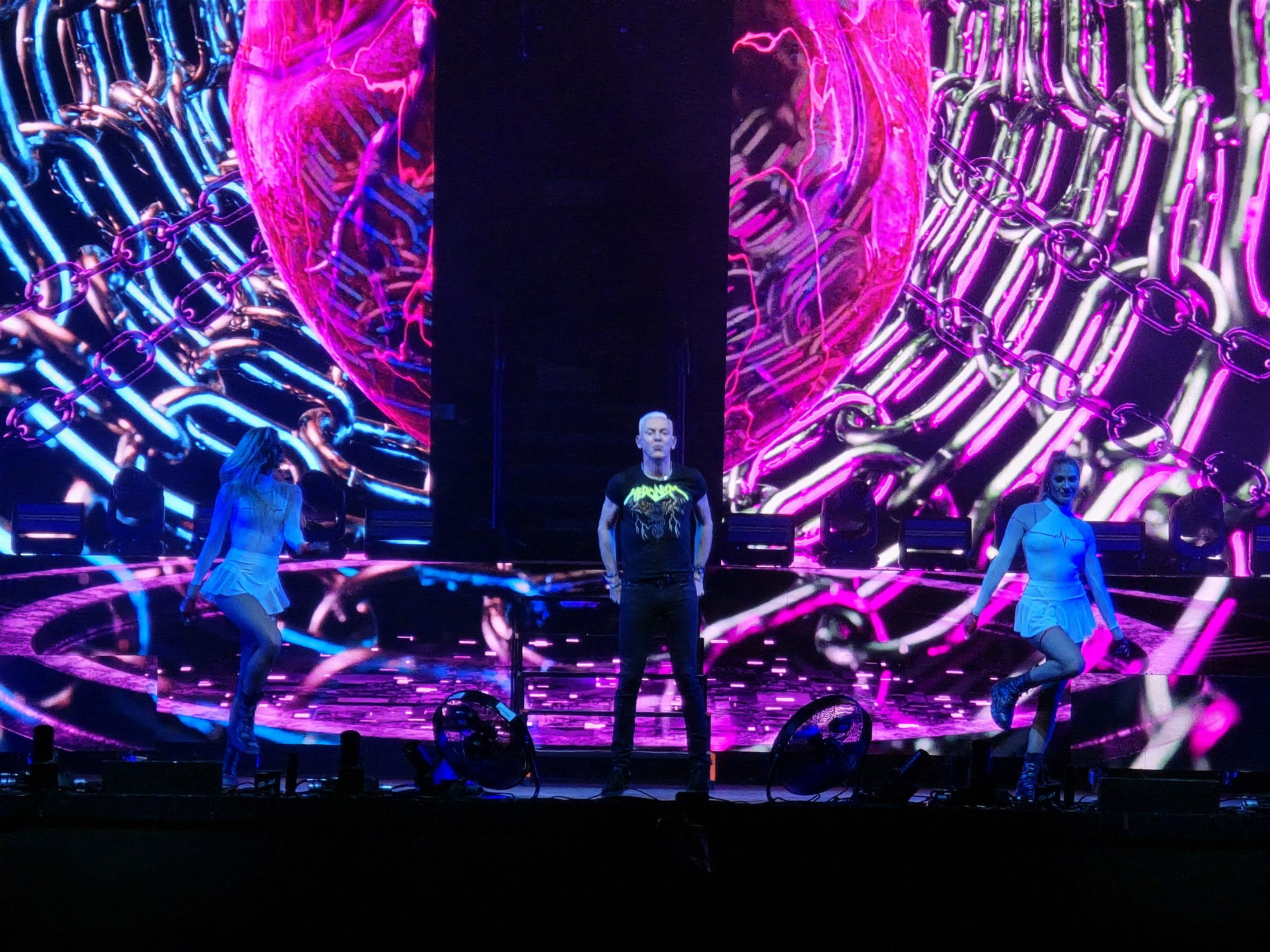 Und wie Eingangs schon erwähnt ergänzt durch die „Performance“ der beiden Bandmitglieder an den Keyboards und den Tänzerinnen, die auch im Mittelteil einen eigenen Part hatten, wo sie futuristisch, aber auch gekonnt mit Spagat & Co. ihr Können zeigten.